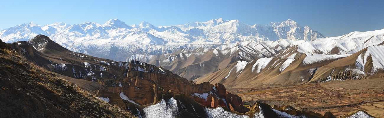 La terre aride et colorée contraste avec les sommets enneigés qui courent à l’infini. Lo Mantang, ville fortifiée...